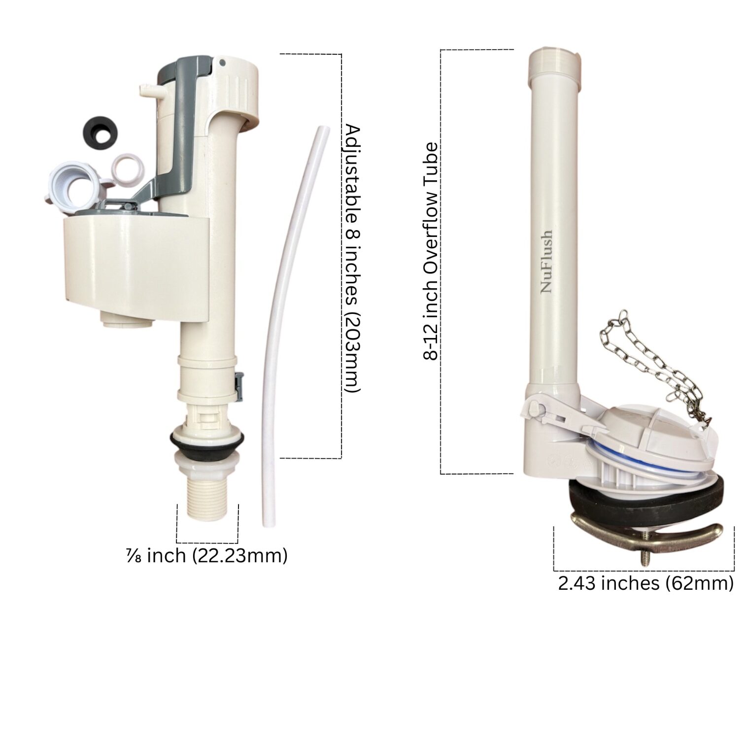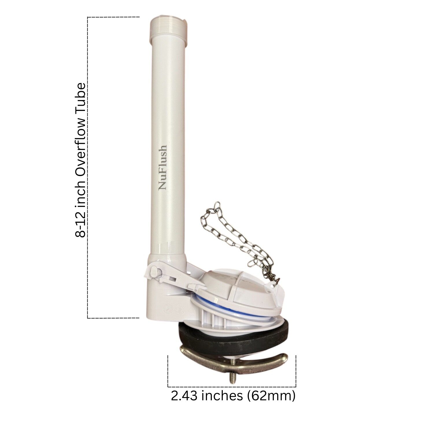 - Flush Valve: 2.43 inch flush valve with 10 inch tall overflow tube.